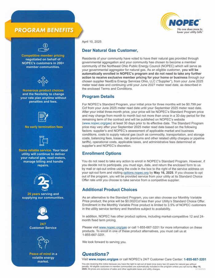 The enrollment letter provides information about your community’s natural gas aggregation program for the enrollment period beginning with your June 2025 meter read date. The letter details the Standard Program Price, other rate options available to you, and how to opt-out of the aggregation program if you choose to do so.